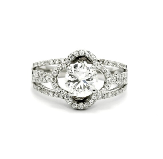Unique Clover Shaped Floating Halo Engagement Ring 1 Carat Forever Brilliant Moissanite 35 Carat Diamond Accent Stones Anniversary Ring