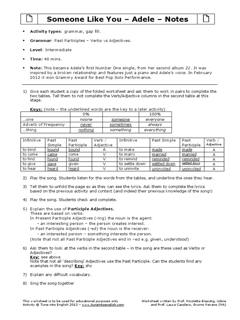Song Lesson Someone Like You By Adele Esl Worksheet By