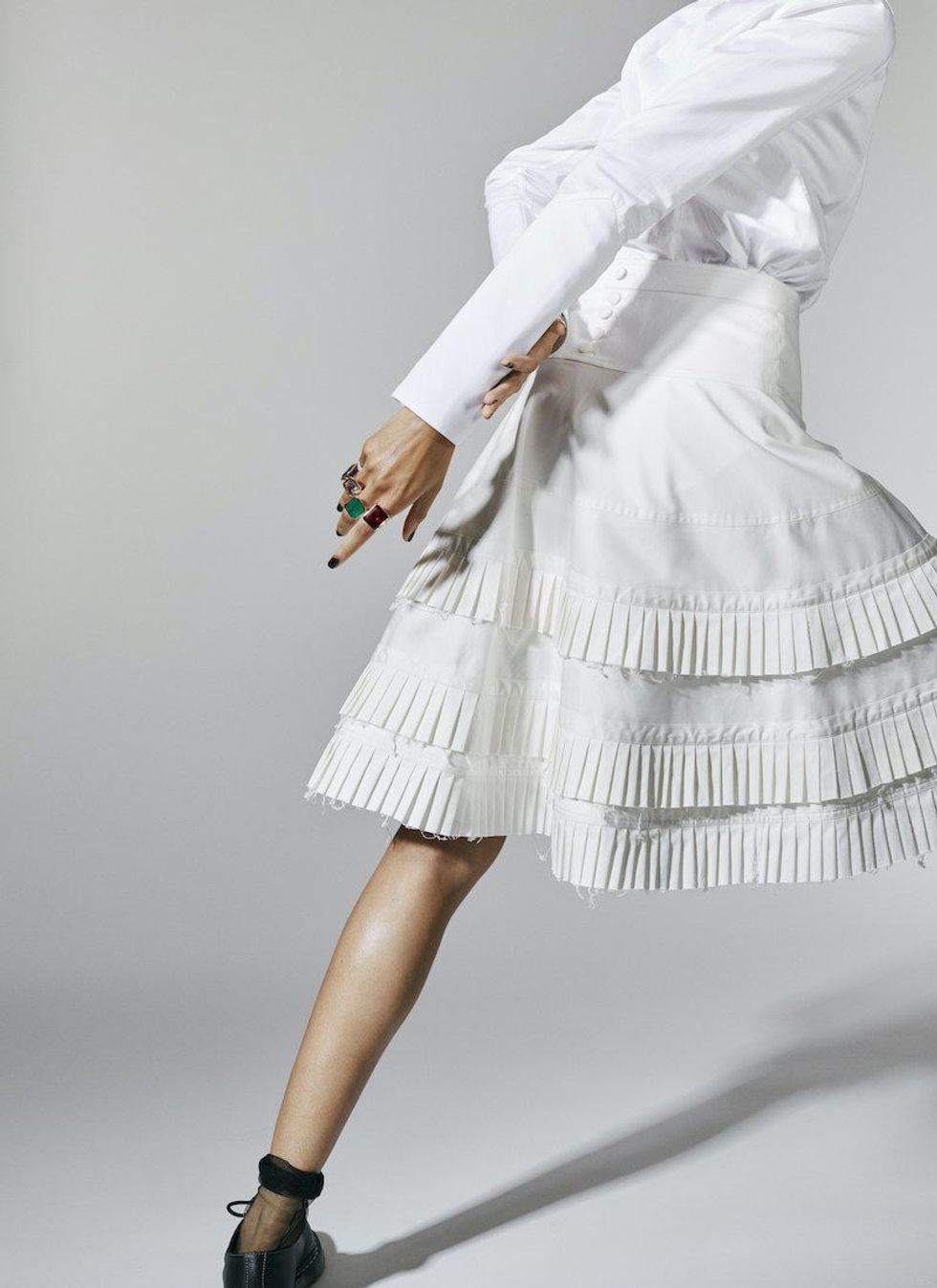 "A reissued Alaia dress from the 1990 Spring show. Naomi Campbell wore it and when Alaia reissued it in 2019—it's a dress I never took off! Christophe Lemaire trousers, an old Charvet shirt, a Comme des Garçons skirt and my husband's Champion sweatshirt."